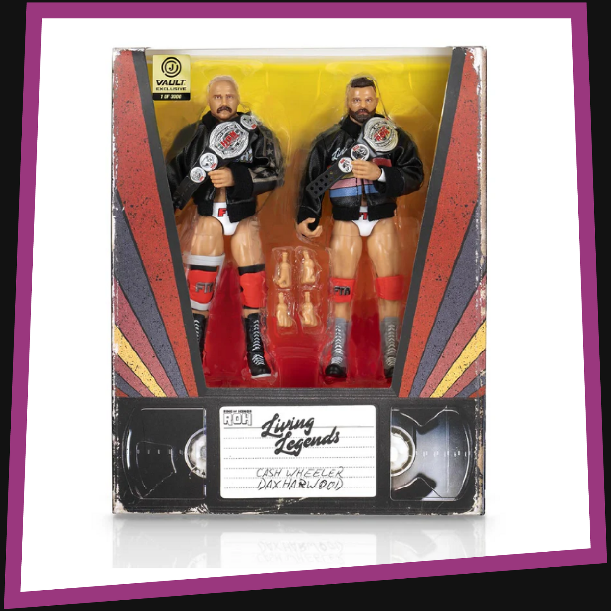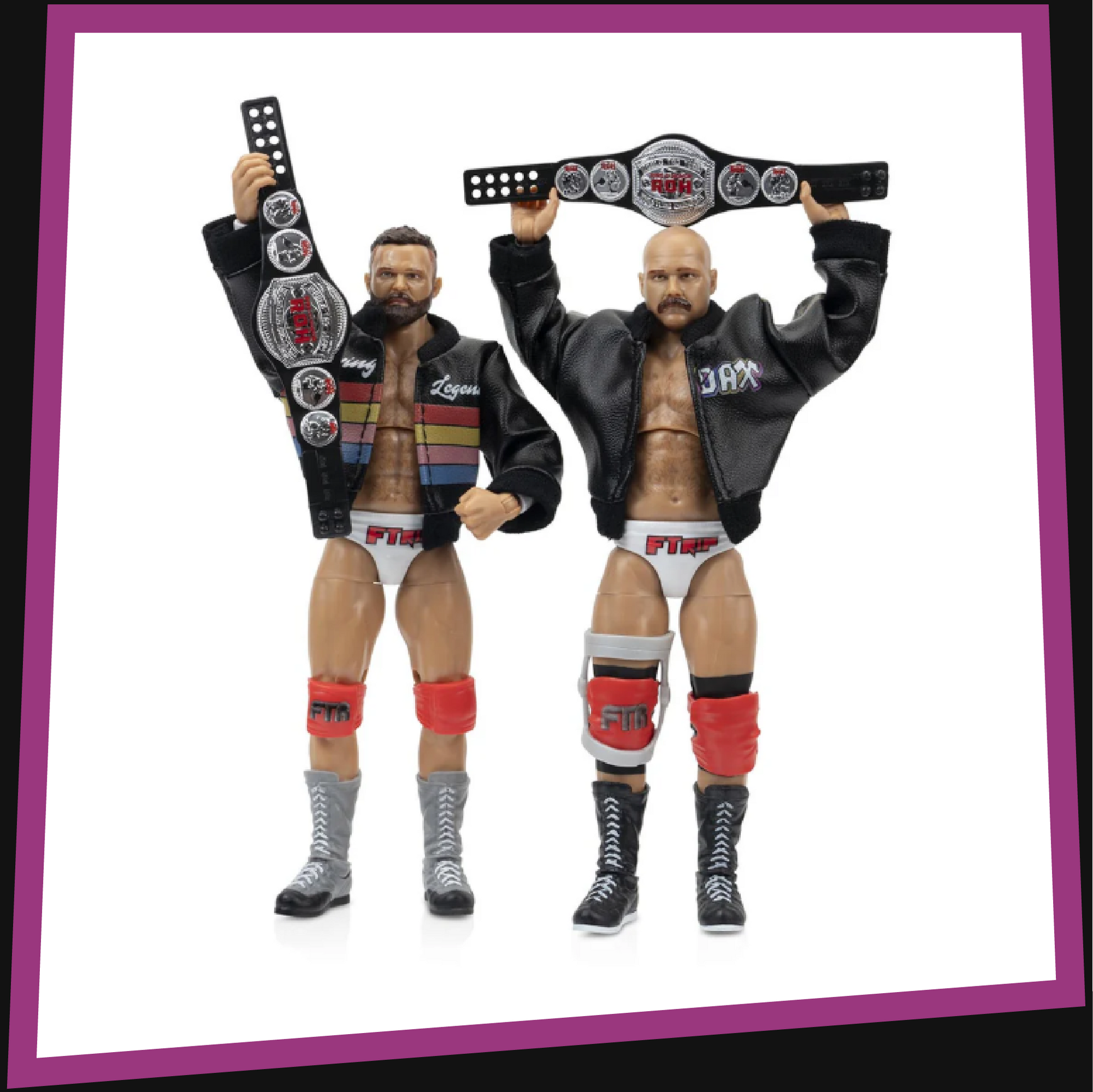 Make new home videos with the ROH FTR 2-Pack. This exclusive new set features two 6-inch figures of Cash Wheeler and Dax Harwood. Each includes 25 points of articulation and come equipped with entrance jackets, alternate fists, and title belts.